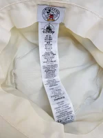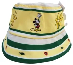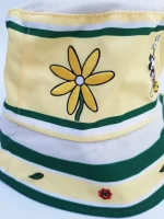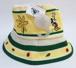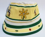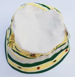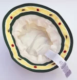 Yellow and white fabric hat, with dark green banding.