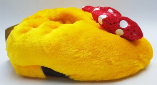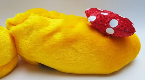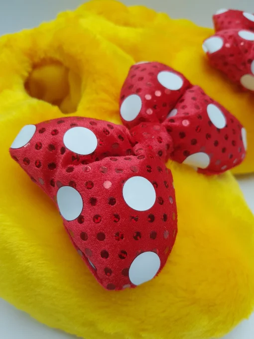 - Bright yellow plush with polka dot bows