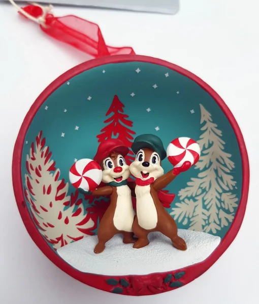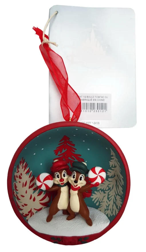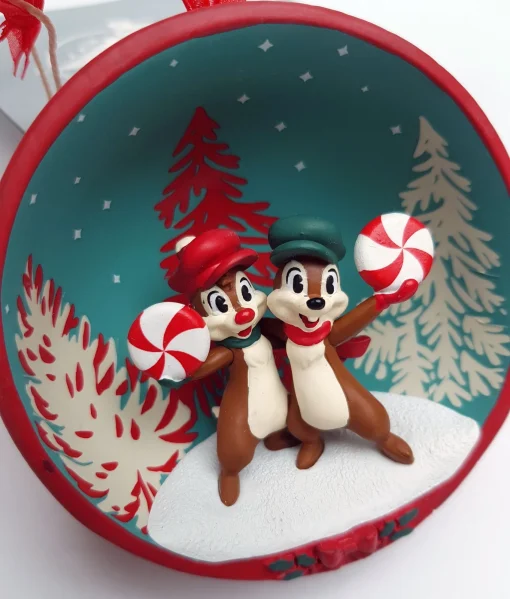 Make mischief all through the holiday season as inspired by this sweet ornament featuring the cheery chipmunks Chip ‘n Dale! Wonderfully capturing the lovable pair, the sculpted ornament features festive detail inside a half-globe shaped bauble.