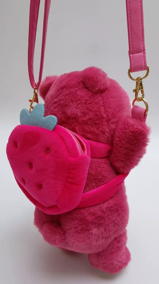 - Lotso wears a soft, strawberry backpack