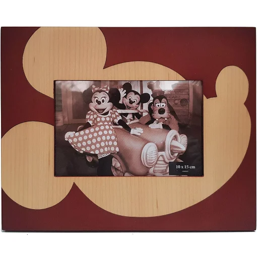 - In a cherry wood colour, with an incised carved shape of Mickey Mouse in a lighter wood colour
