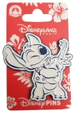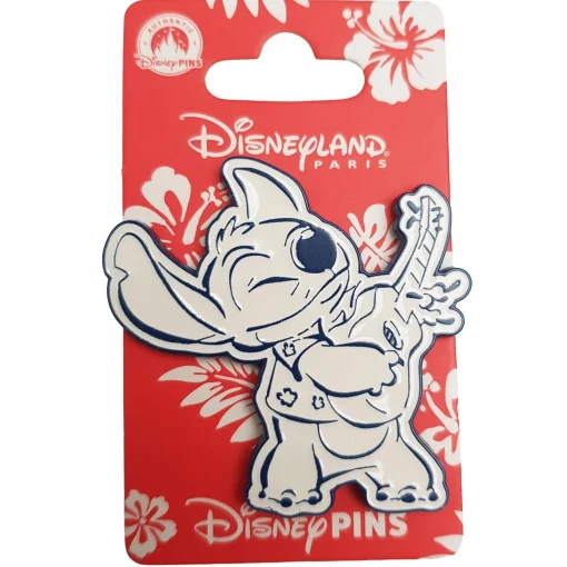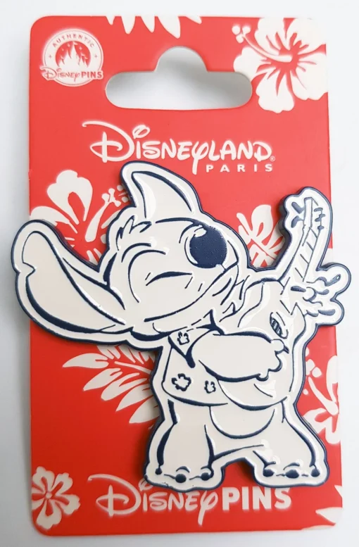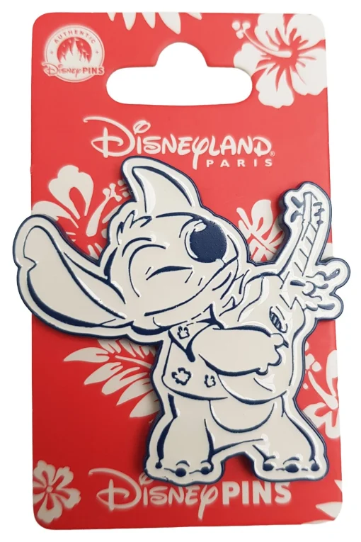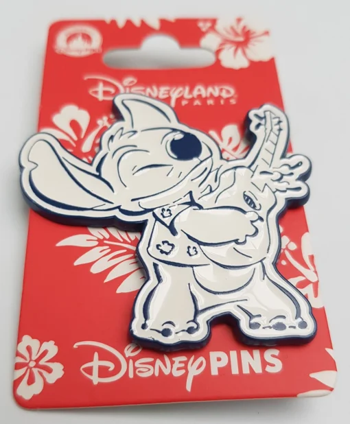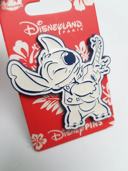 Blue and white pin featuring Stitch playing a guitar!